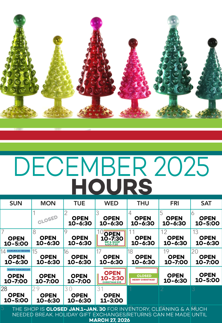 If you see something you love on our website, be sure to order it on the website and select "In-Store Pickup" or "Shipping" as needed. Our website inventory is 100% separate from our brick-and-mortar shop inventory.