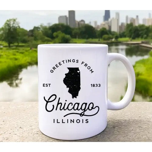 This 15 ounce white gloss ceramic mug is microwave and dishwasher safe and can be used for your favorite beverage - coffee, tea, hot chocolate, and more! The illustration says "Greetings from Chicago Illinois" and "Est 1833" with a shaded outline of the state of Illinois. The design is printed on both sides of the mug.