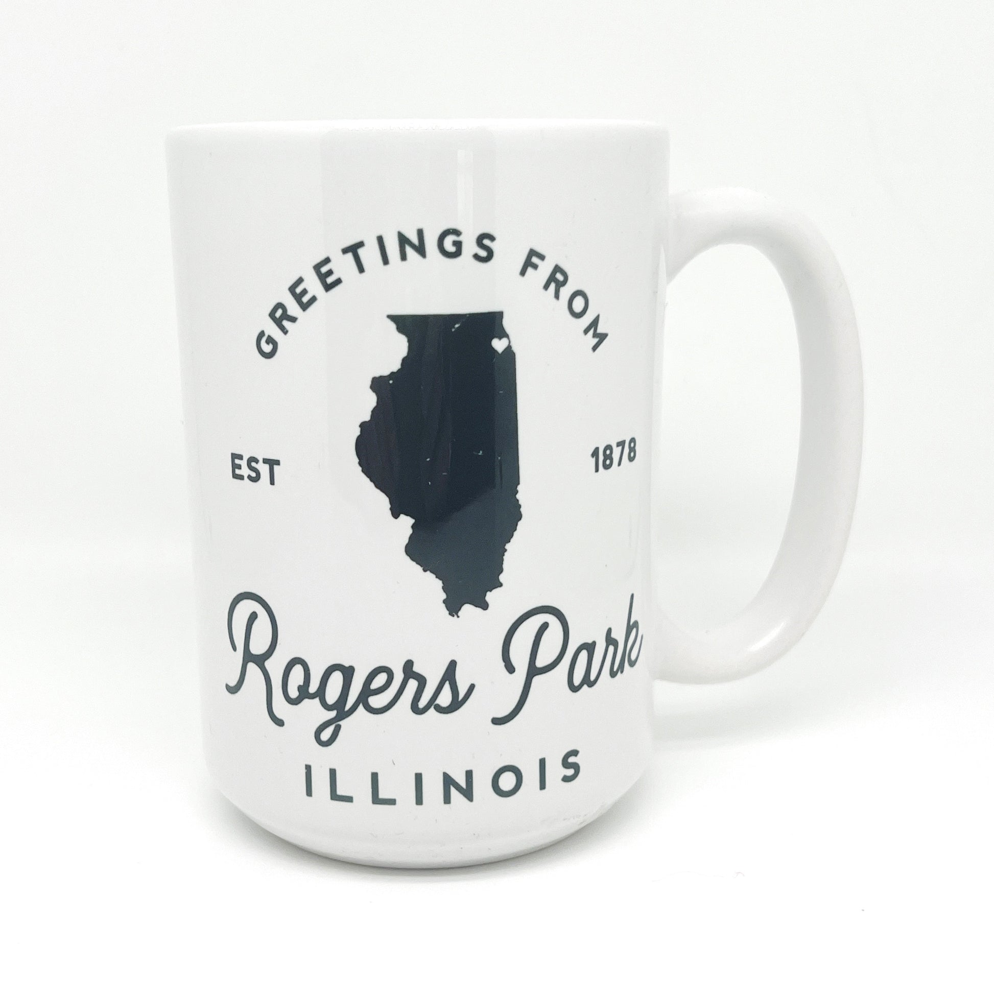 This 15 ounce white gloss ceramic mug is microwave and dishwasher safe and can be used for your favorite beverage - coffee, tea, hot chocolate, and more! The illustration says "Greetings from Rogers Park Illinois" and "Est 1878" with a shaded outline of the state of Illinois. The design is printed on both sides of the mug.