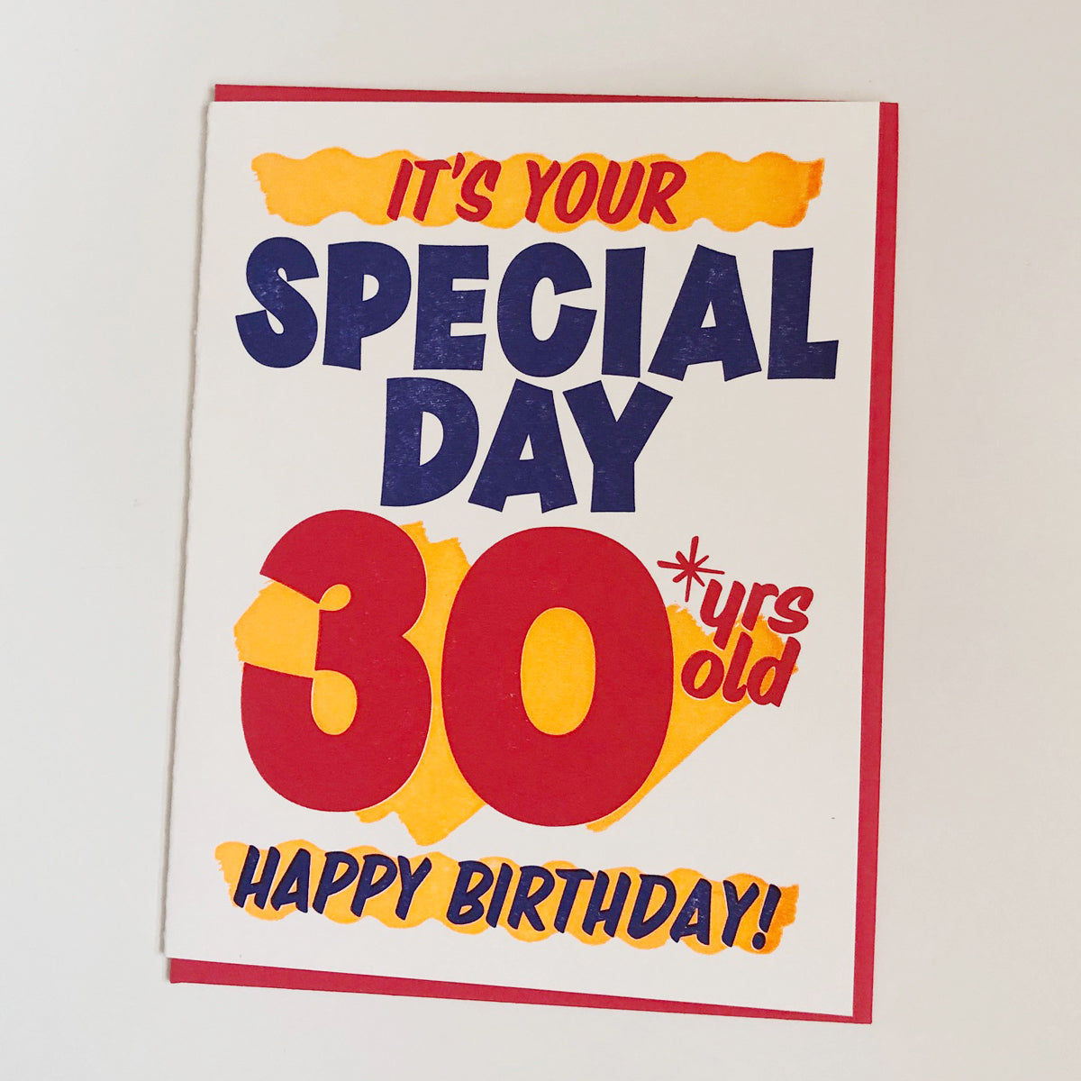 This milestone birthday folded card is inspired by hand-painted grocery store signs. Blank inside, leaving ample room for a handwritten message.