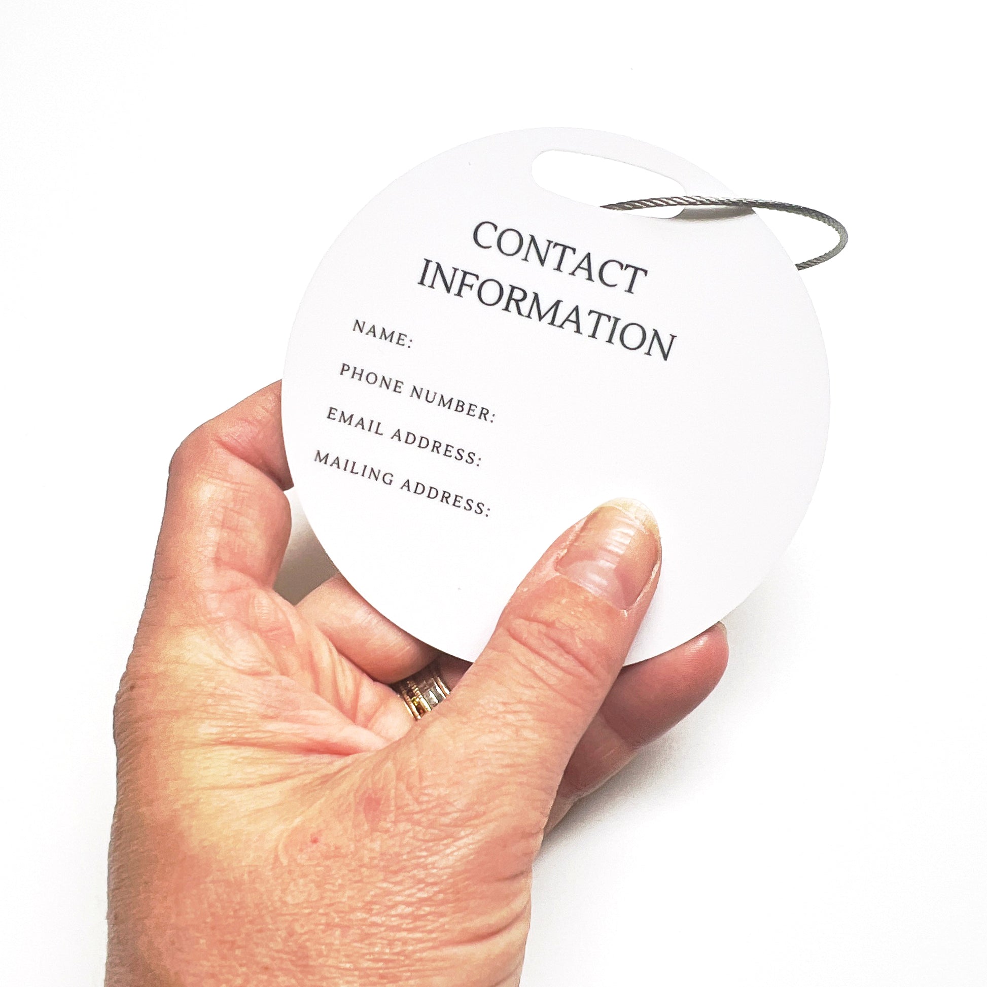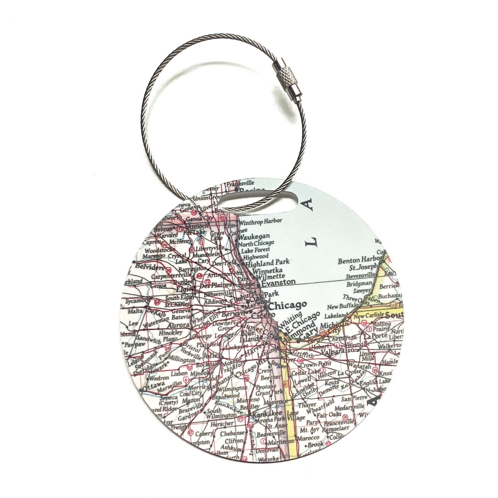 This 4" round metal Chicago Luggage Tag has a map of the city on one side and is white on the back to write your contact information (use a permanent marker to write on it). The tag attaches to luggage with a durable cable attachment. An excellent professional or personal gift for the avid traveler.