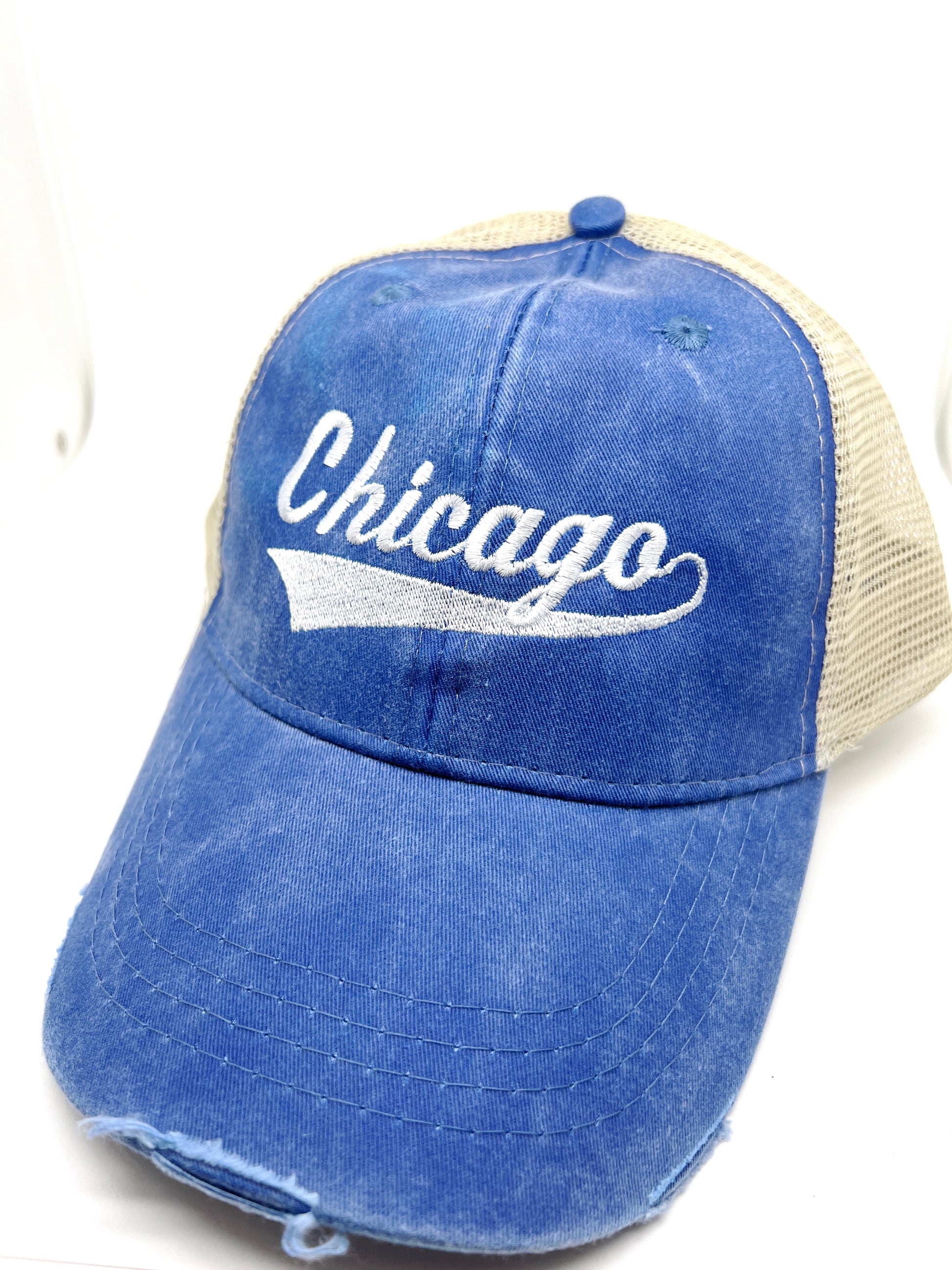 This distressed trucker hat features a custom script embroidered in an athletic font on the front. The hat has a vintage, worn-in look. The mesh back allows for breathability and the adjustable snap closure ensures a comfortable fit.