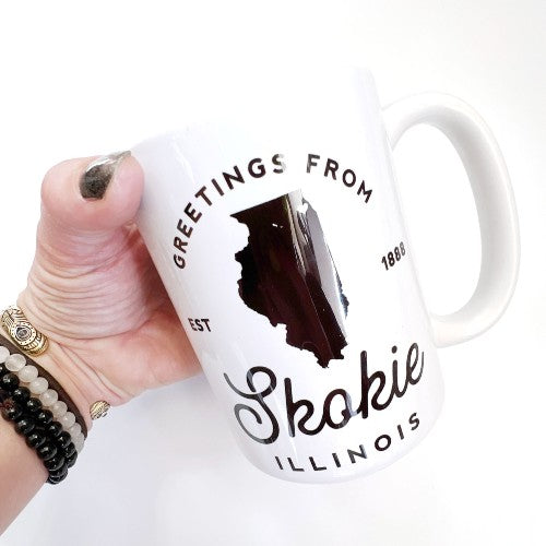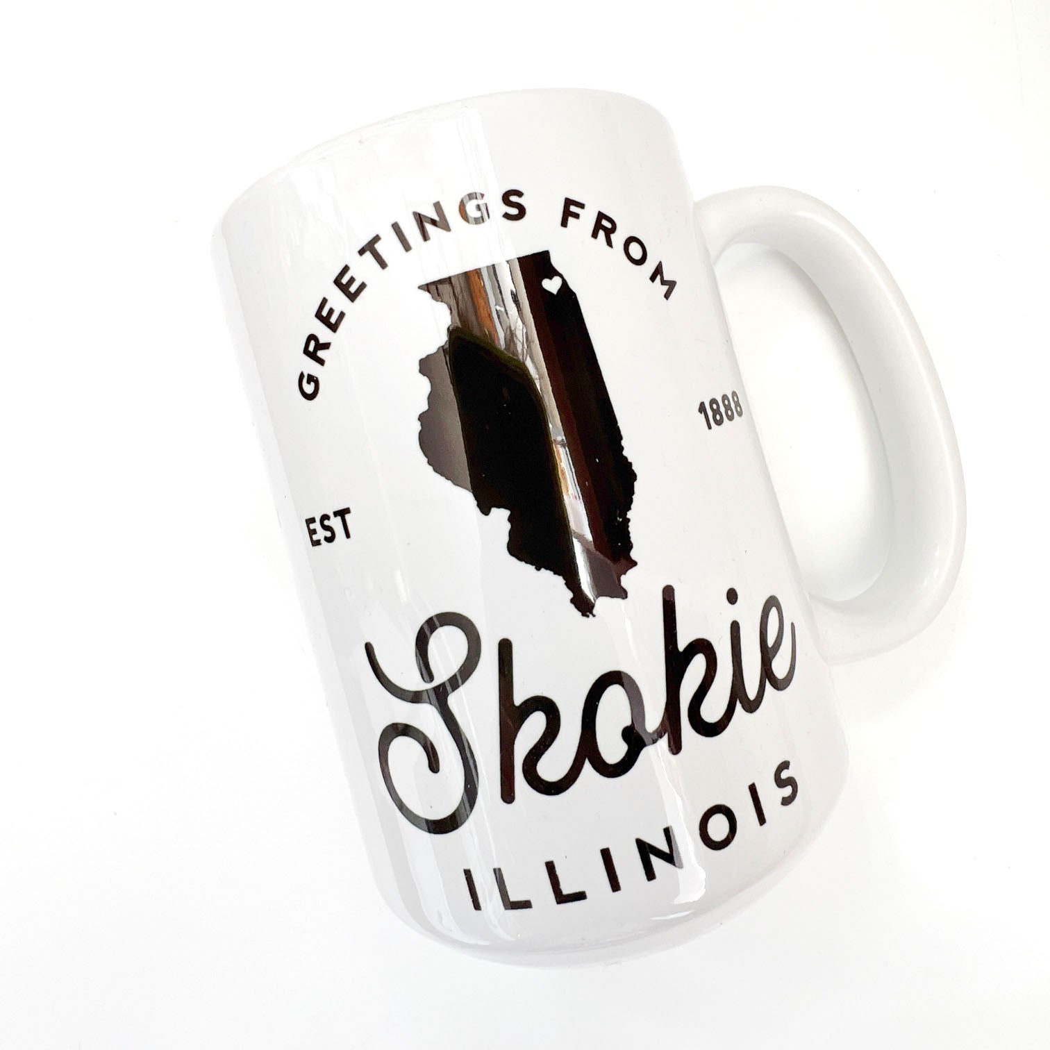 This 15 ounce white gloss ceramic mug is microwave and dishwasher safe and can be used for your favorite beverage - coffee, tea, hot chocolate, and more! The illustration says "Greetings from Skokie Illinois" and "Est 1888" with a shaded outline of the state of Illinois. The design is printed on both sides of the mug.