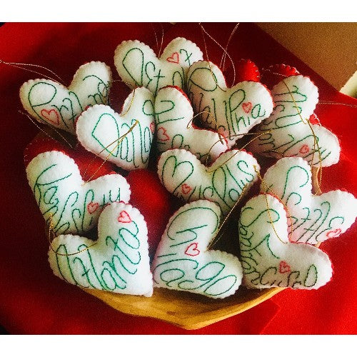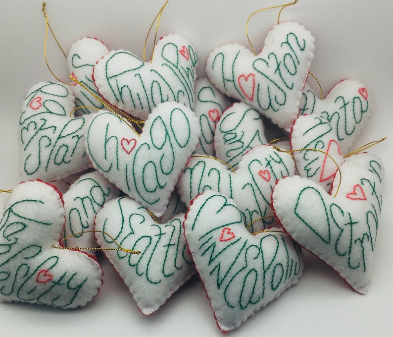 Bring some hometown pride to the tree this year with an original design embroidered felt heart ornament. Whether you live in a big city, small town, or are proud or your individual neighborhood, this ornament is a win.