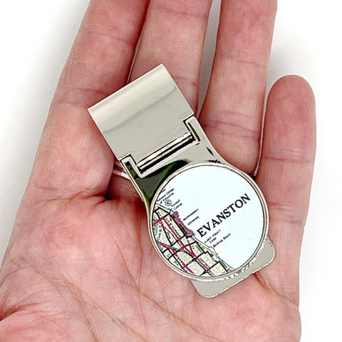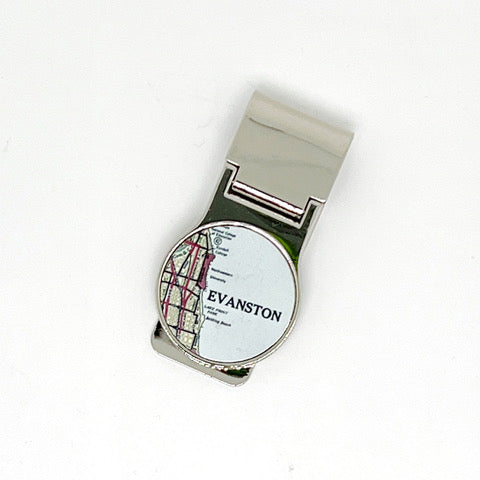 This zinc alloy money clip features a vintage Evanston map to add a touch of class to an ensemble. Snap-down clip keeps cash secure.