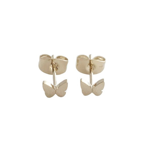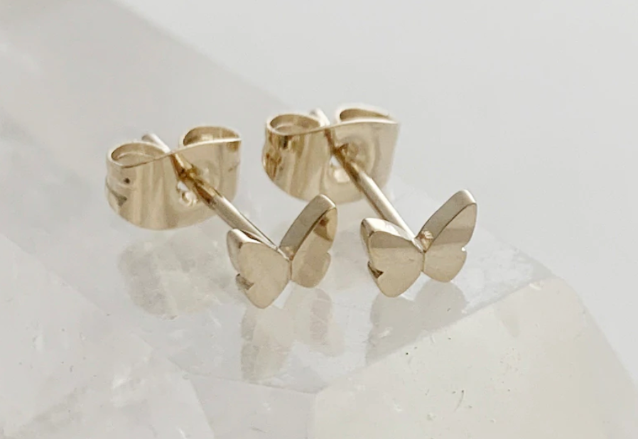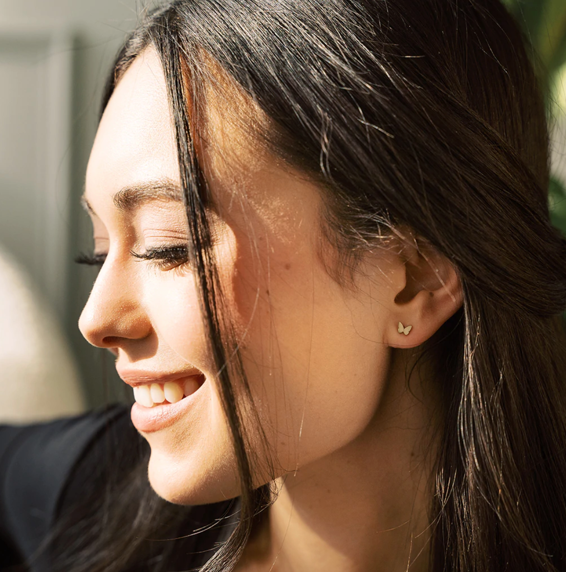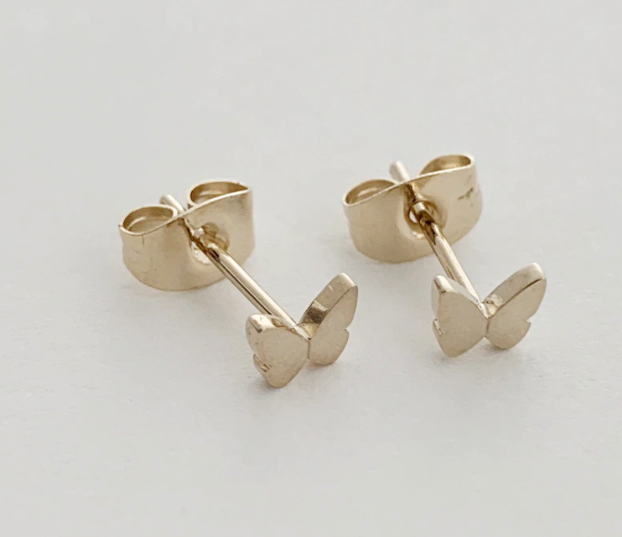 Dainty butterfly studs in a minimal, effortless silhouette. Wear them solo or grouped alongside your favorite earrings (they play amazingly well with others). 4mm x 5mm.