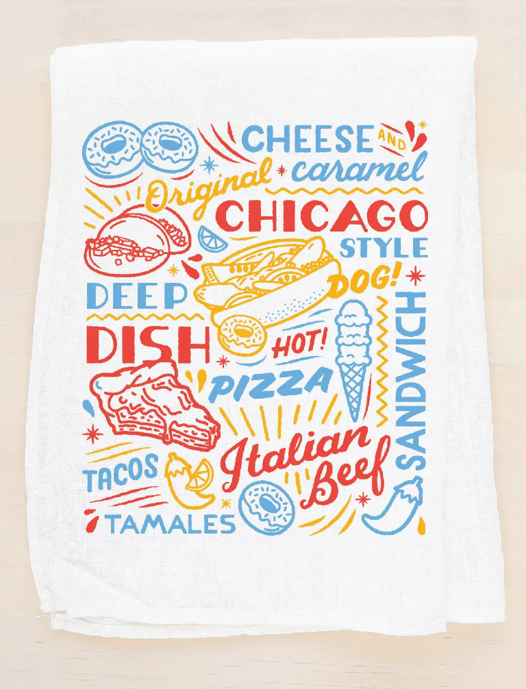 Oh, how we love the iconic food of Chicago! This makes a great welcome gift, going away gift, missing home gift or hostess gift. 27" x 24" tea towel/bar towel. Cotton flour sack material.